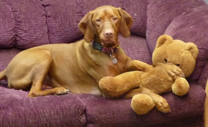 Below, Maggie, February 2014, posed with the same family member..lap time is good time according to these Vizslas!