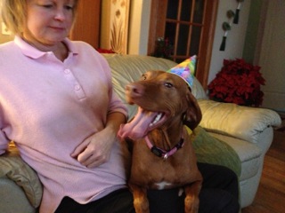 Hailee celebrated her second birthday with a party! She had a balloon on her chair and party hats for her and her Vizsla friend and then special treats too.